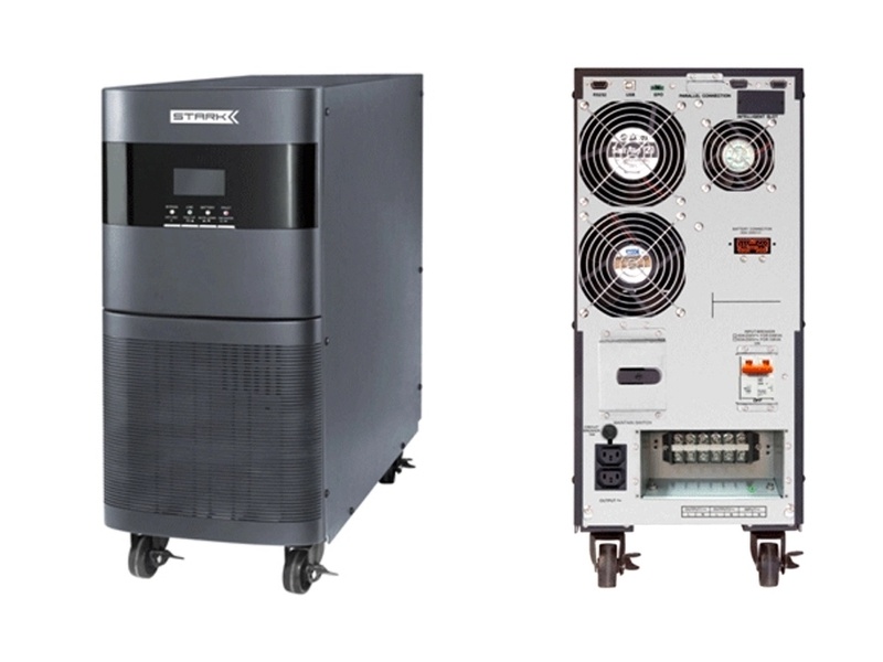 Stark Country 6000 Online 4A - Источник бесперебойного питания для построения систем качественного электро питания для компьютеров и серверов, ЖК телевизоров и аудио-видео техники, системы пожарной и охранной сигнализации, точных электронных приборов, медицинской техники, электроники газовых котлов. Максимальная мощность нагрузки, которую можно подключить к ИБП - 4800 Вт. Использовать на пределе возможности инвертора ИБП не рекомендуется из соображения надежности и срока службы. Поэтому если оборудование потребляет близкую к 4800 Вт мощность, рекомендуется выбрать модель ИБП Stark 10000 Online (7000 Вт). При выборе ИБП по мощности необходимо учитывать пусковые токи активной нагрузки, которые, пусть на несколько секунд, но превышают номинальные значения в 3-5 раз.